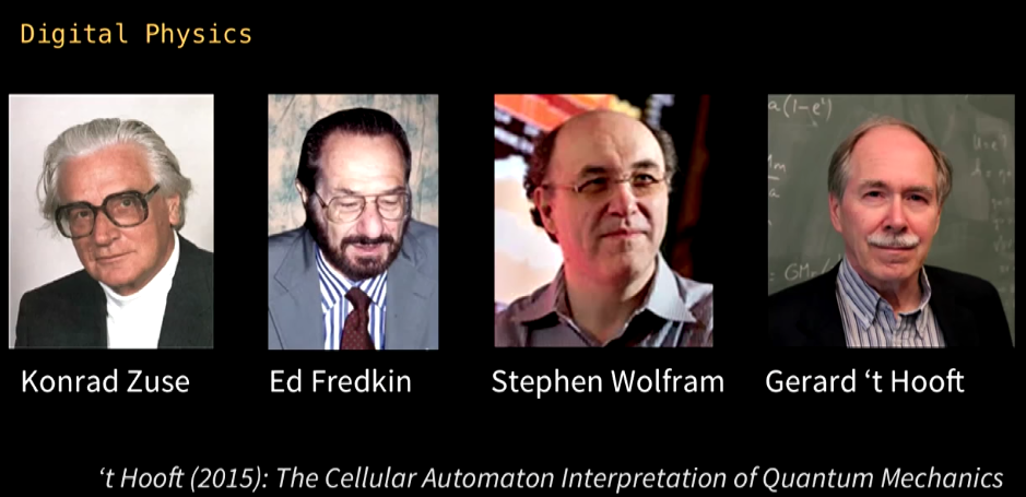__Zuse was the first to propose that physics is just computation, suggesting that the history of our universe is being computed on, say, a cellular automaton. His “Rechnender Raum” (Computing Cosmos / Calculating Space https://doi.org/10.1007/978-3-663-02723-2 ) started the field of Digital Physics in 1967.__ — via Zuse’s Thesis * Zuse hypothesis * Algorithmic Theory of Everything * Digital Physics, Rechnender Raum (Computing Space, Computing Cosmos) * Computable Universe * The Universe is a Computer * Theory of Everything