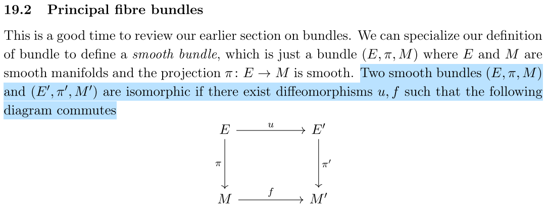 Very roughly speaking, a principal fibre bundle is a bundle whose typical fibre is a Lie group. Principal fibre bundles are so immensely important because they allow us to understand any fibre bundle with fibre \[F\] on which a Lie group \[G\] acts. These are then called associated bundle, and will be discussed later on.